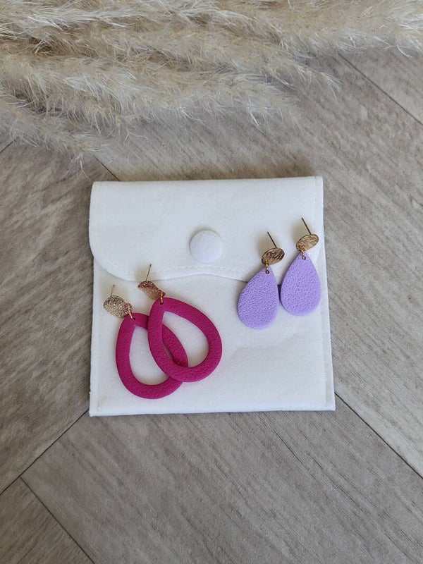 Het zakje is van zachte stof gemaakt. De witte en grijze zakjes zijn van vilt. De roze zakjes zijn van suède.