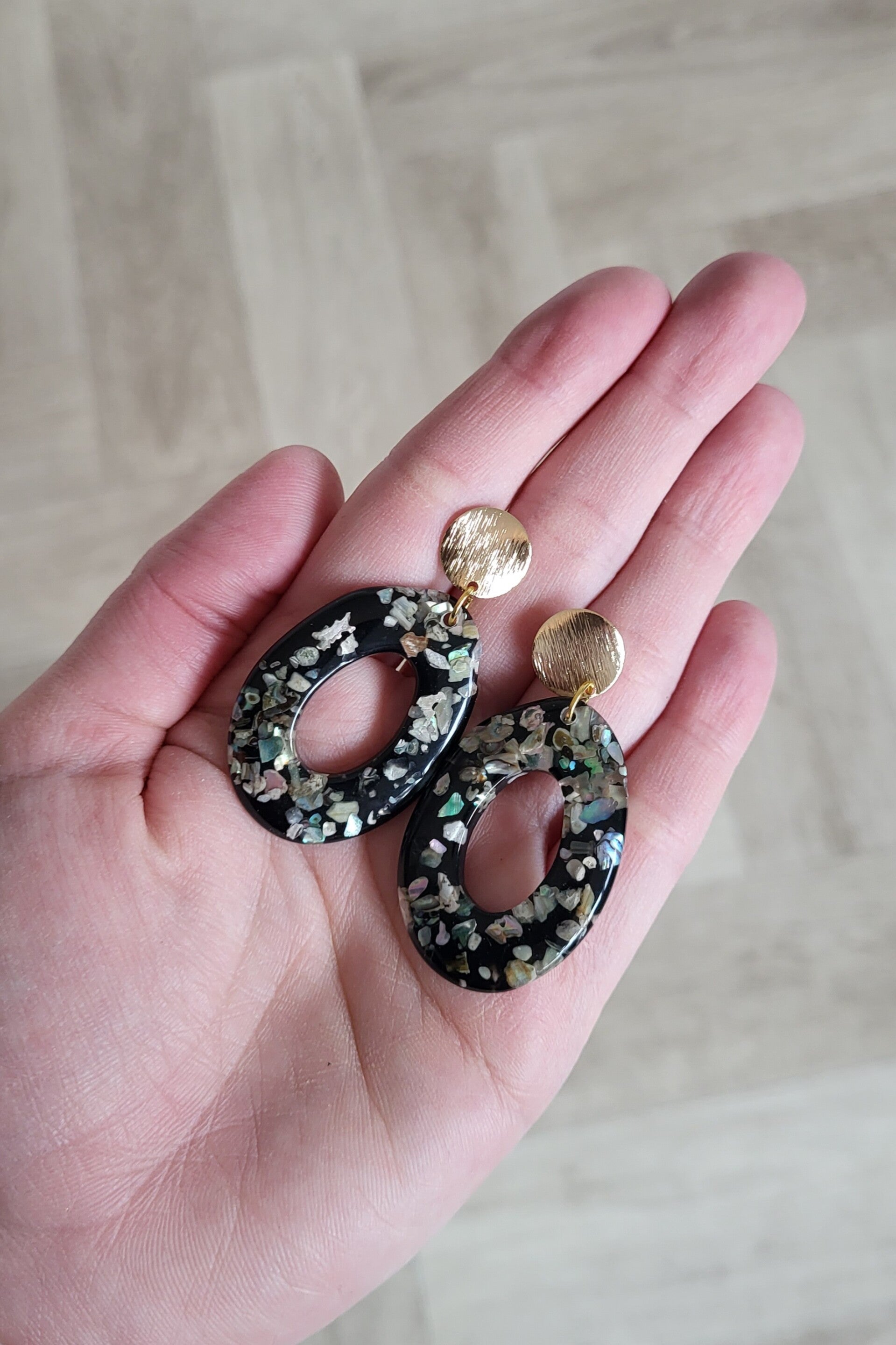 Een prachtige statementoorbel van lichtgewicht acryl met glimmende bladglitters. De oorstekerpin is van 24K goud. De oorbellen zijn handgemaakt in Zeeland.
